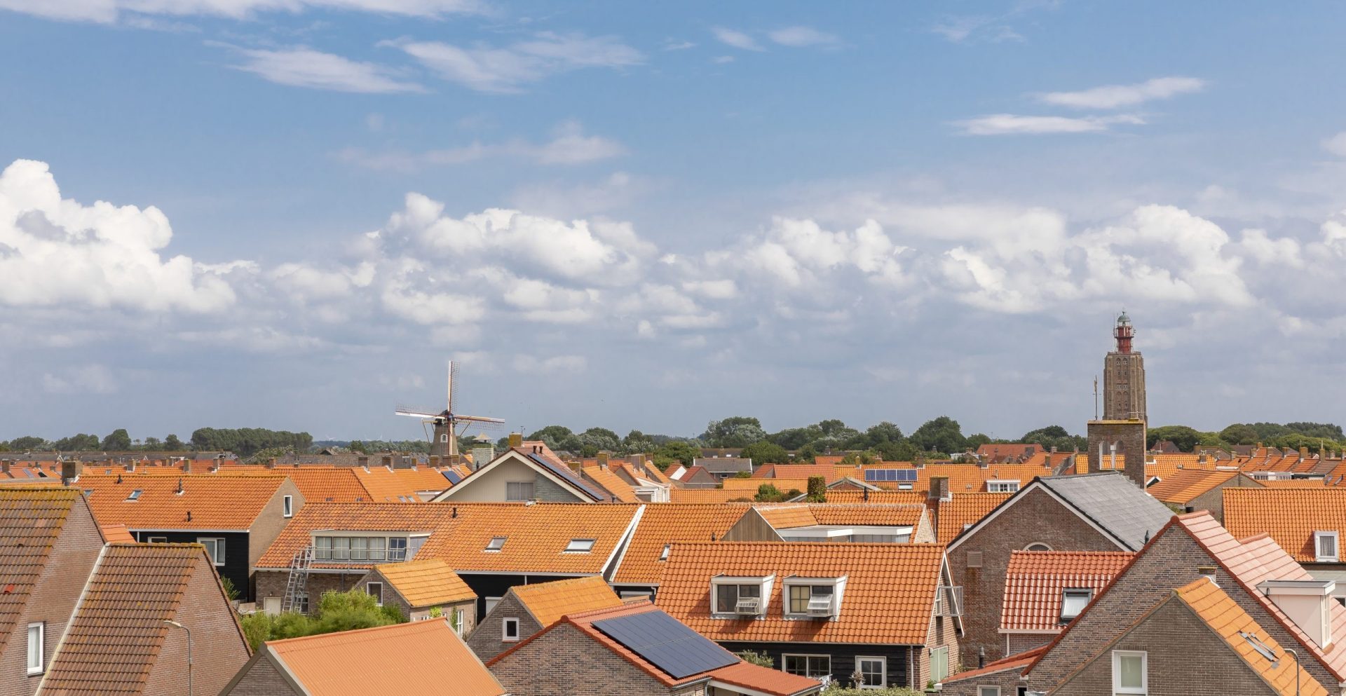 De karakteristieke daken achter de dijk, Westkapelle heeft veel unieke aangezichten en de daken zijn er zeker één van. Ook de vuurtoren en molen komen mooi naar voren.