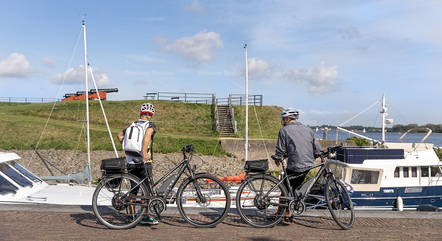 Fietsers op een zonnige dag in de haven van het mooie Veere