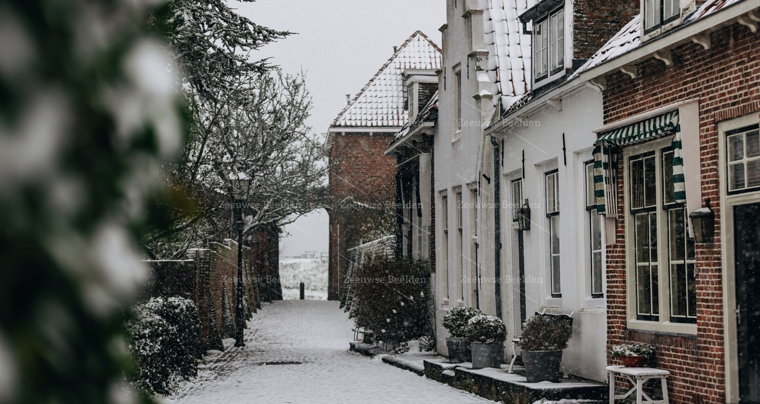 Deze foto geeft de sfeer van het historische stadje Veere goed weer, kleine huisjes in de sneeuw met de veste in de achtergrond.