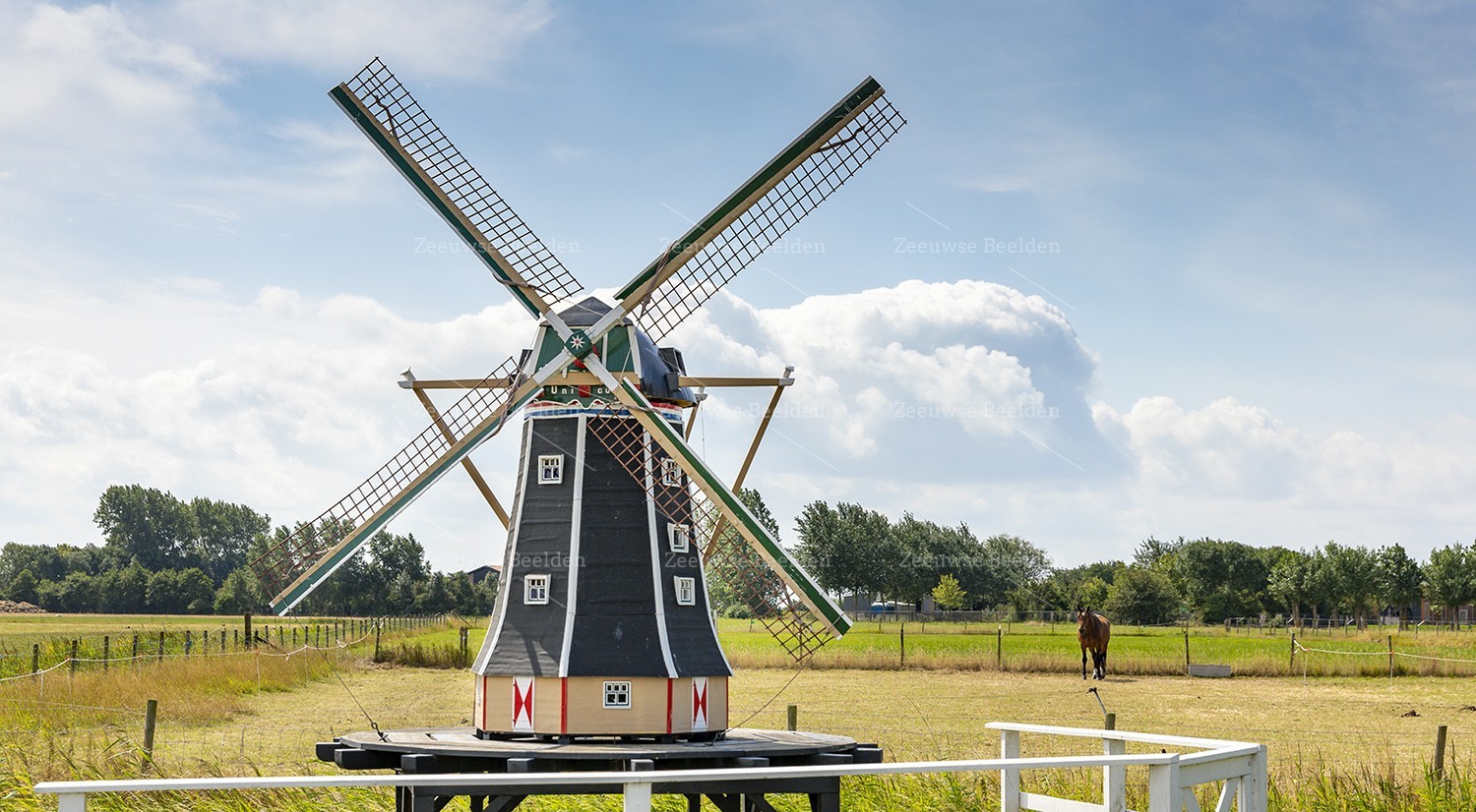 Op deze foto staat een model van de model in Aagtekerke, deze is ook te vinden naast de daadwerkelijke molen in Aagtekerke. Op de achtergrond een paard in de wei.