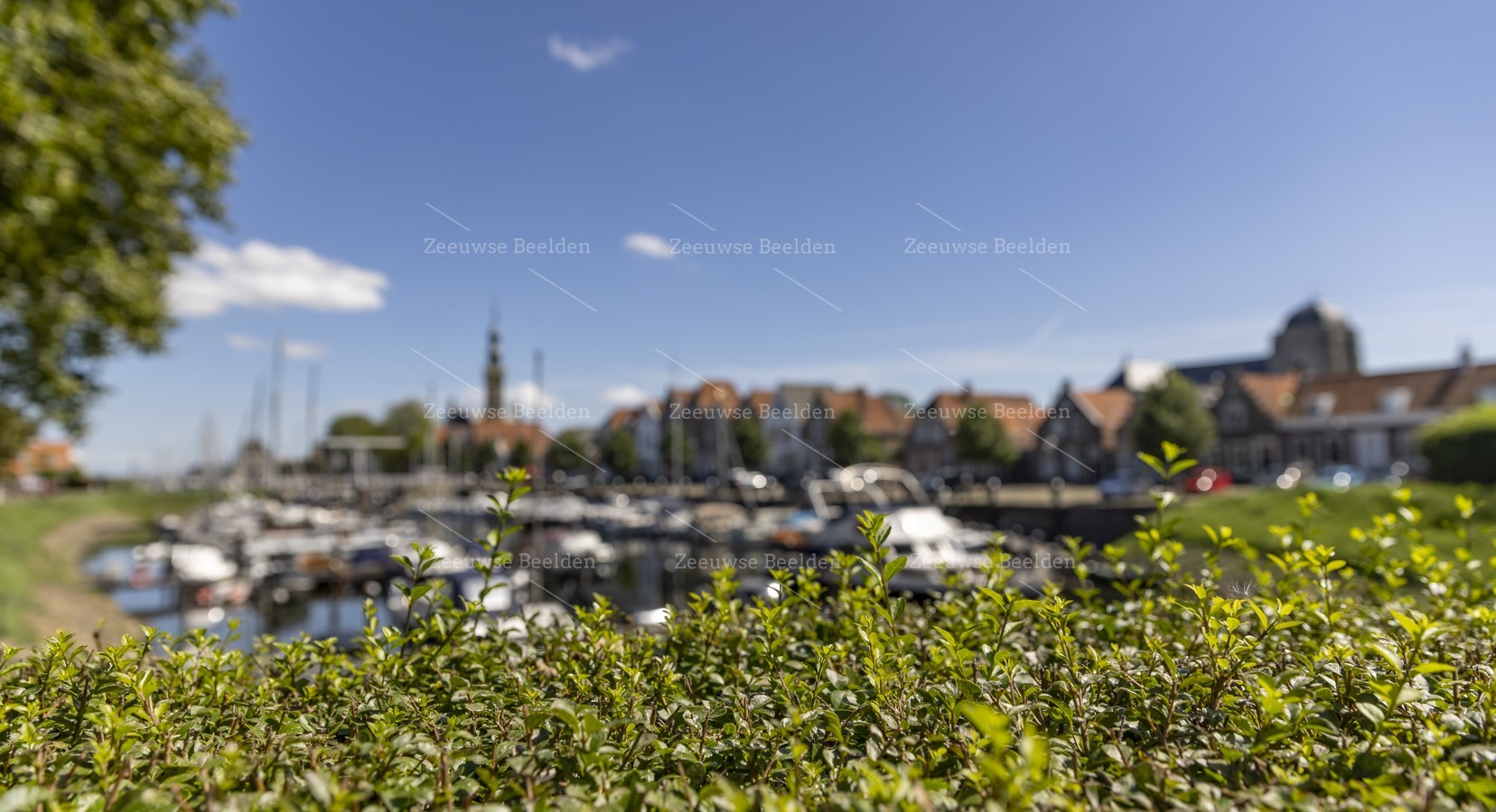 Bosjes met wazig Veere op de achtergrond
