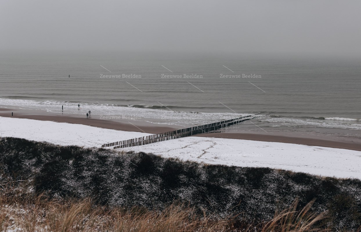 Alles veranderd met een laagje sneeuw. Ook de kustlijn met haar strandpalen krijgen een volledig ander aangezicht.