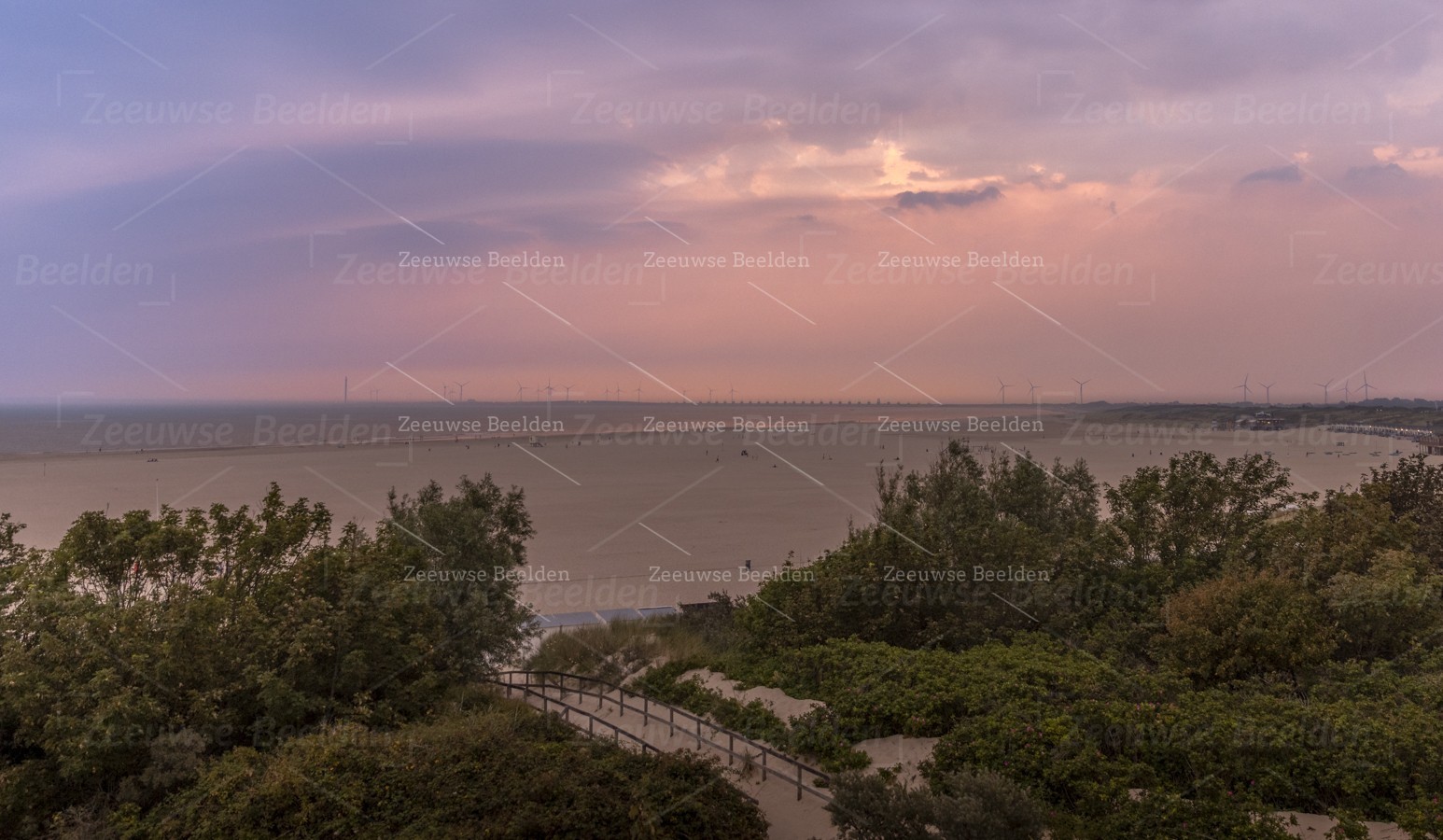 Prachtig roze gekleurde lucht op het strand van Vrouwenpolder met de Oosterscheldekering op de achtergrond